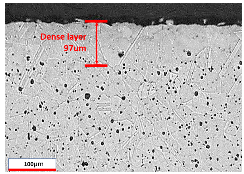 圖2.典型的MIM 316L燒結(jié)后得金相顯微結(jié)構(gòu) – 表面致密高但內(nèi)部有許多氣孔。細(xì)小得粉末幫狀MIM零件獲得更厚的表面致密層(圖片是廣州有研粉體科技有限公司提供)